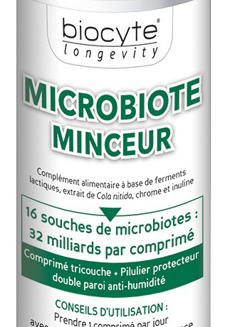 У Microbiote Minceur входять пробіотичні культури, екстракти грейпфрута, зеленого чаю, малини, а також вітаміни B1, B2, B3, B5, B6, B8, B9 та B12.